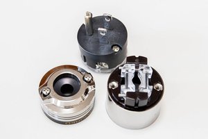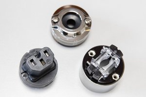続いてプラグとコネクターを分解して、どういう構造になっているか確認しましょう。細かいネジなどが多いので、紛失しないように気をつけてください。機器に接続される側がコネクター「AC-037」、コンセント側になるのがプラグ「AP-037」です。この2モデルは、電極に銀メッキ、さらにロジウムメッキで仕上げたものです。メッキの種類でも音が違いますので、お好みのものを選択してください。