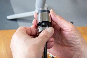 中央のパーツは「クランパー」となっており、ケーブルをプラグに固定することができます。このクランパーも最初の状態では締まっているので、一度ドライバーで緩めます。クランパーを緩める回転数は数えておいて、左右同じくらいの締め付けにしたほうが良いですね。どちらかの締め付けが緩いと、最後に組み立てるときに歪んでしまうことがあります。