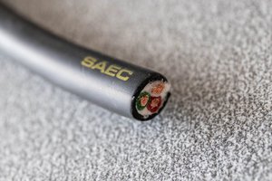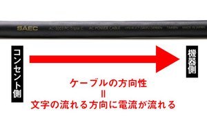 それから、ケーブルには「方向性」がありますから、必ずその方向性を確認してください。矢印が記載されている場合もありますが、矢印がない場合は、被覆にあるブランド名や型番などの、「文字の方向に電流が流れる」方向で作成してください。たとえば今回のサエクのケーブルの場合は、SAECのS側がコンセント側のプラグ「AP-037」に、C側が機器側のコネクター「AC-037」になるのが正解ということになります。
