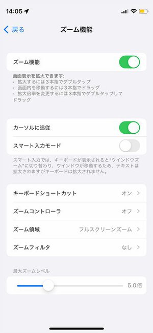 事前の設定も[設定]アプリの[アクセシビリティ]にある[ズーム機能]をオンにしておくだけ。同じ画面でズーム動作の細かな設定もできますが、最初は気にしなくてもOKです。