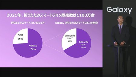 だが、より注目されるのが、折り畳みスマートフォンの販売比率である。折り畳みスマートフォンといえば、タブレット並みの大画面で利用できる、横開きの「Galaxy Z fold」シリーズをイメージする人が多いが、同社によると実は、大画面スマートフォンを折り畳んでコンパクトにできる「Galaxy Z flip」シリーズが、販売数の約3分の2を占めているというのだ。