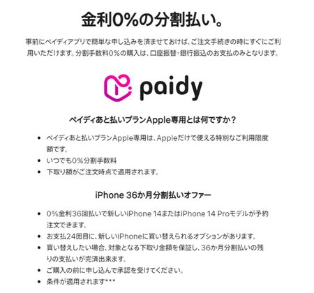 しかも最近では、アップル自身も分割払いで購入してもらうことに力を入れており、後払いサービスの「Paidy」を活用して分割払いでの支払いがしやすくなる「ペイディあと払いプランApple専用」を提供している。さらにiPhone 14の場合、36回の分割払いにすることで、24ヶ月目にiPhoneを下取りに出して新しいiPhoneへと機種変更すれば残額の支払いが不要になる、端末購入プログラムに似た仕組みの「iPhone 36ヶ月分割払いオファー」も利用可能となっている。