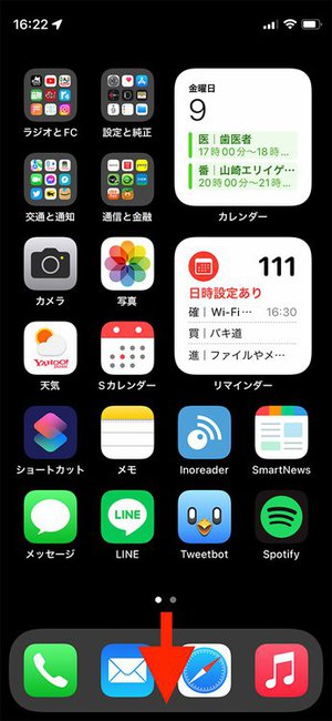 画面の下の端、ドックのあたりをさらに下、画面外に向かって軽く下スワイプしてみてください。すると画面全体が下にスライド。普段なら画面上端である部分が画面の中央付近にまで降りてきます。これなら普通に指が届きます!