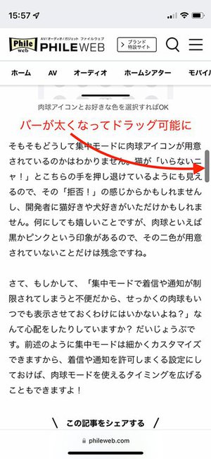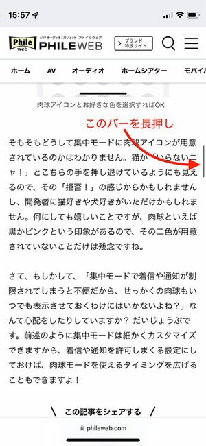 あとスクロール関連では他に、「スクロール中に画面右端に表示されるスクロールバーをドラッグしてつかんでグイグイ動かせば高速スクロールできる」も覚えておくと便利かも。この方法ならいちばん上に戻るだけでなく、上にも下にもどこにでも移動できます。