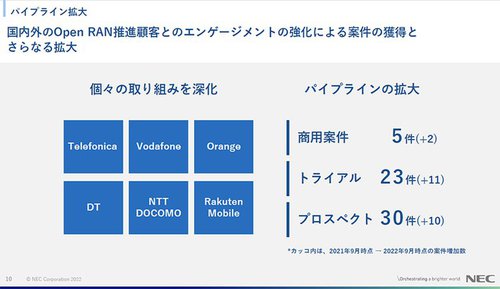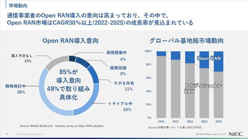 しかも、現状のネットワークは既存の顧客が利用しているだけに、新しい技術の導入には、慎重な姿勢を見せる携帯電話会社も多いようだ。実際にNECも、一部の顧客がオープンRANの導入に慎重になり検証が遅れたことなどから、2022年度の計画見直しを余儀なくされたという。