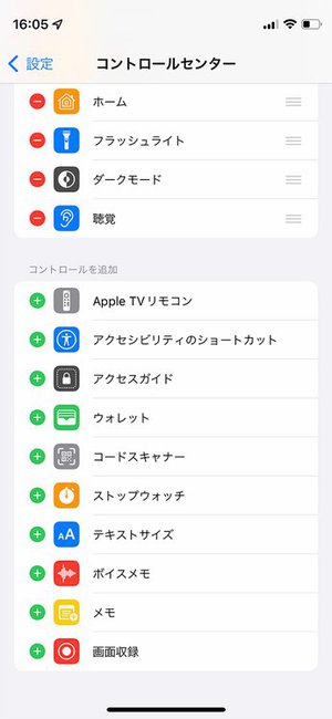コントロールセンターに[聴覚]が出ていない場合には、[設定]アプリの[コントロールセンター]から[聴覚]をオンにして追加します。