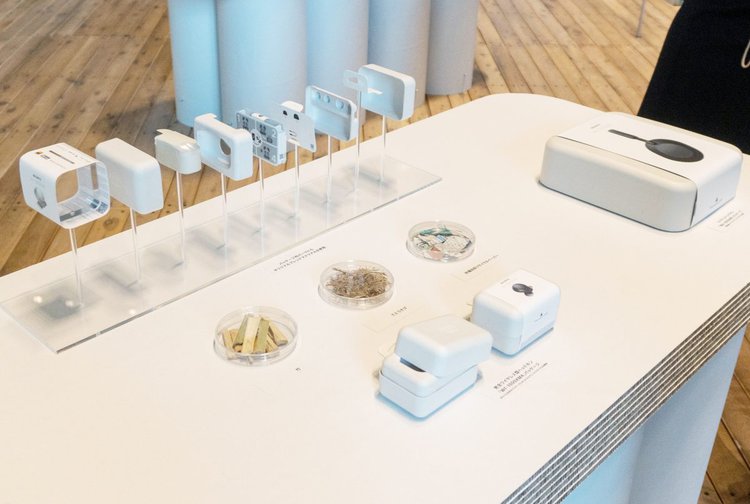 このオリジナルブレンドマテリアル、要は紙なのだが、竹やさとうきびなどの成長が速い植物の端材にリサイクルペーパーなどを組み合わせて成形したもの。これをできる限り印刷したり加色したりすることなく利用し、環境負荷を減らす。メーカーや製品のロゴは印刷せず、成形時に「立体として表現」しているが、これはパッケージをリサイクルする際、印刷していない方が良質な紙として再生できるからだ。