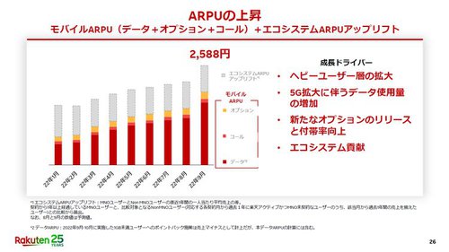 ただ、今回の楽天グループの決算で公表した数値を見ると、月額0円廃止という判断もやむなし、と思えてしまうのが正直なところだ。それはARPU(Average Revenue Per User)、要はユーザー1人当たりの平均売上であり、携帯電話サービスのように月額課金制のサービスでは良く用いられる指標である。