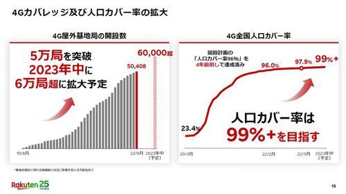 楽天モバイルは、2023年中に基地局を6万局超に増やして、人口カバー率を99%超にまで広げたいとしているが、今後は郊外でのエリア拡大や都市部でのトラフィック対策などが主。これまでのように整備を急ぐ必要はなくなってくるので、基地局整備にかけるコストも大幅に低減できると見ているようだ。