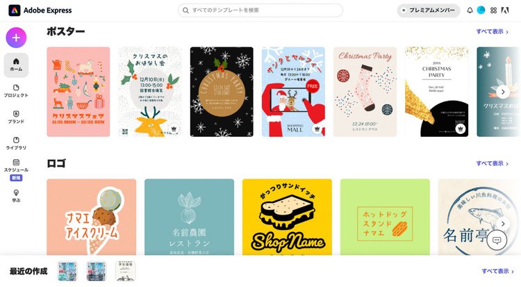 使い始めるのは簡単。「https://www.adobe.com/jp/express/」にアクセスすればいい。プロジェクトから作りたい内容を選んでクリックすると、グラフィックツールに近い画面が現れる。