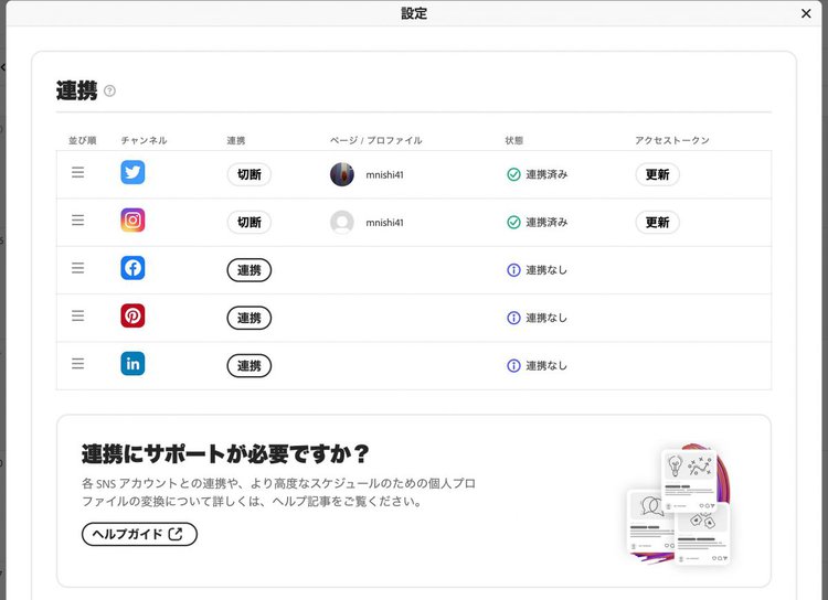 前出のようにグラフィックを作ってプロジェクトとして保存したら、左端にある「スケジュール」に移動。ここでAdobe Expressに、各SNSのアカウントを紐付けて、自動投稿可能にしておく。