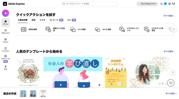 Adobe Expressは、前出のように無料で使えるツールだ。ダウンロードの必要はなく、ウェブブラウザー経由で全ての機能が使える。有料の「プレミアムプラン」(月額1078円)もあり、こちらの場合、フォトストックやテンプレートの追加、Creative Cloudなどとの連携が追加される。