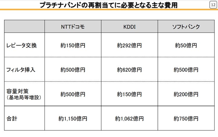 その結果総務省が打ち出したのは、楽天モバイルの主張をほぼ全面的に受け入れるという結論を打ち出している。実際、同タスクフォースの報告書案では、プラチナバンド再割り当ての移行期間は5年以上としながらも、準備ができたエリアから順次プラチナバンドが使えるようにするとしているほか、再割り当てにかかる工事費用は全て既存免許人。要は、現在プラチナバンドを保有する3社が負担すべきとされている。