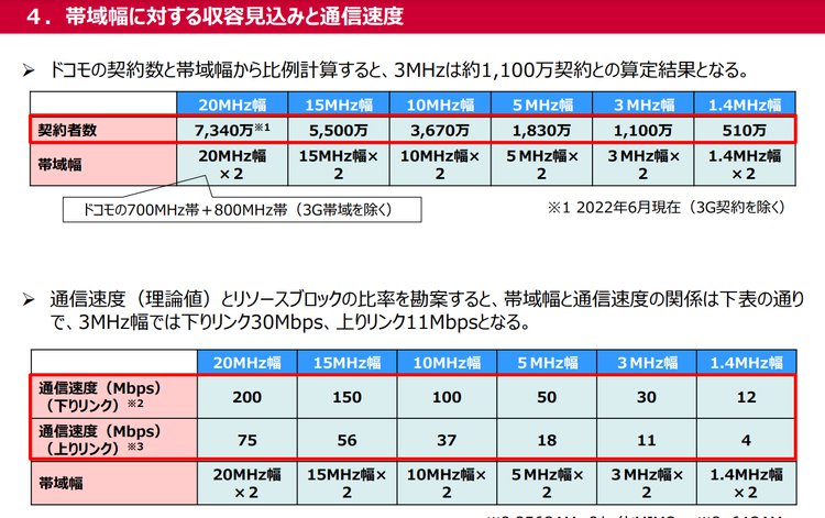 そこで動きを見せたのがNTTドコモであり、同社は総務省が2022年11月30日に実施した、情報通信審議会 情報通信技術分科会 新世代モバイル通信システム委員会 技術検討作業班で、「700MHz帯への狭帯域4Gシステム導入の提案」をして注目されている。