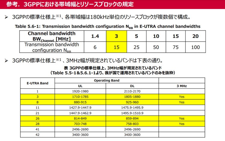 またNTTドコモによると、3MHz幅での利用は標準化団体の3GPPの仕様で定められているもので、米国やインドなどでは実際に3MHz幅の帯域が利用されている実績もあるとのこと。