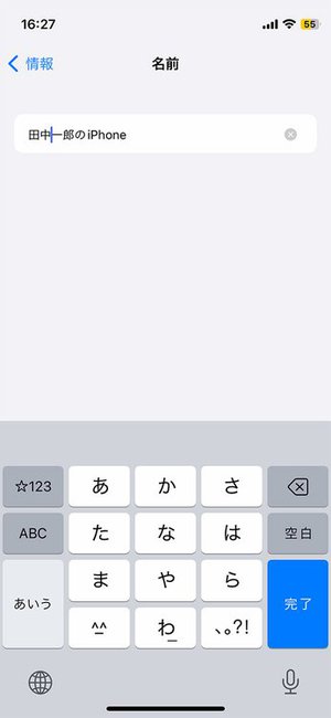 [名前]の初期設定には、例えば「田中一郎」さんだったら「一郎のiPhone」のように、Apple IDに登録している姓名の「名」が使われています。「普段は『田中』さんって呼ばれてるから『一郎』とだけ表示されても相手にはわかりにくいかも」なんてこともあるかもしれません。いずれにせよ、iPhoneの名前は確認し、設定し直しておくのがおすすめです。
