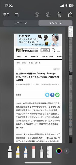 スクショしておきたいウェブページなどを開いている状態で、まずはいつも通りの操作でスクリーンショットを撮影。画面左下に、撮影したスクショのサムネールが表示されますよね。それをタップしてスクショ編集画面を表示。するとその上側に[スクリーン][フルページ]を切り替えるスライドボタンが用意されています。それを[フルページ]に切り替えましょう。