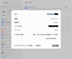 ●Mac:AirPodsをMacに接続して装着した状態で[システム設定]アプリ>[Bluetooth]に進み、AirPodsの横にある[オプション]ボタンをクリック>[このMacに接続]の設定を[自動]から[このMacに前回接続していた場合]に変更