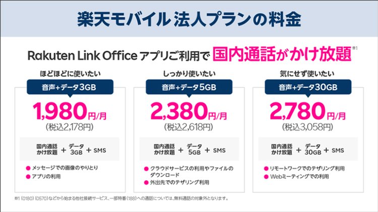 そしてもう1つ、楽天モバイルが1月30日に打ち出したのが「楽天モバイル法人プラン」である。これは名前の通り、企業向けのモバイル通信サービスであり、個人向けサービスと同様、法人向けの専用アプリ「Rakuten Link Office」を用いることで、国内通話が無料でかけ放題になるというのが大きな特徴となるようだ。