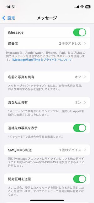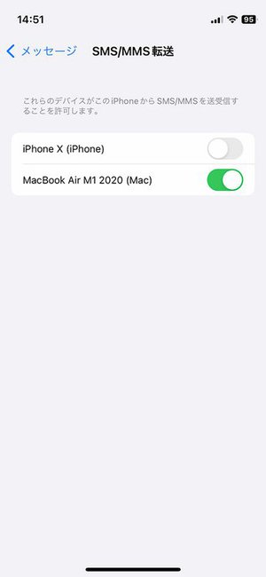 ●iPhone側:[設定]アプリ>[メッセージ]>[SMS/MMS転送]で転送先のMacを選択