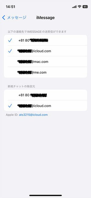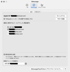 ●Mac側:[メッセージ]アプリの[設定]画面>[iMessega]タブ>[着信に使用するメールアドレス/電話番号]で電話番号を選択