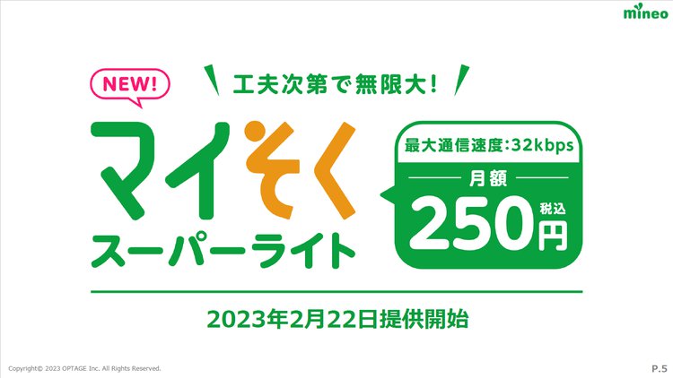 それは、1月31日に発表された「マイそく スーパーライト」というもの。これは月額250円で利用できる料金プランなのだが、利用できるのは従量制の通話と最大32kbpsのデータ通信のみ。実際にはpovo 2.0同様、オプションを組み合わせて利用するスタイルが取られており、同時に提供が発表された「10分通話パック」(月額110円)を利用すれば、月額360円で10分間の通話が可能と、ライトな通話ニーズに応えられるという。