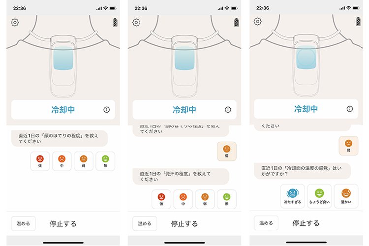 一方でアプリの使い勝手は大きく変化している。これまでのソフトウェアとは異なる仕組みを採っており、ユーザー自身で冷感レベルの設定をする必要はない。使い始めると、アプリから温度の感じ方について質問され、「冷たすぎる」「ちょうど良い」「温かい」の3つから回答を選択し、対話するような形でコントロールされる。