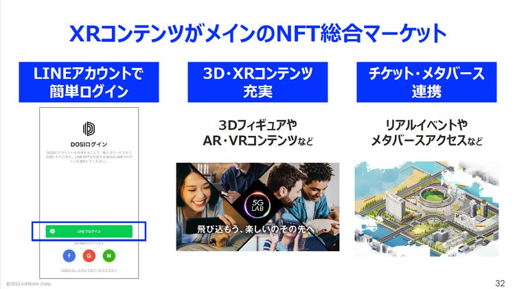 そしてもう1つが、「NFT LAB」の展開だ。これはその名前の通り、ブロックチェーン技術などを用いて価値が保証されたデジタルデータ「NFT」(Non-Fungible Token、非代替性トークン)を扱うマーケットで、ソフトバンクの実質的傘下にあるLINE社らが設立した、LINE Xenesisが持つプラットフォームを活用することで、LINE IDを用いてNFTの売買を手軽にできる仕組みを提供するとしており、それを各種メタバースサービスと連携することでマネタイズを進めていく考えのようだ。