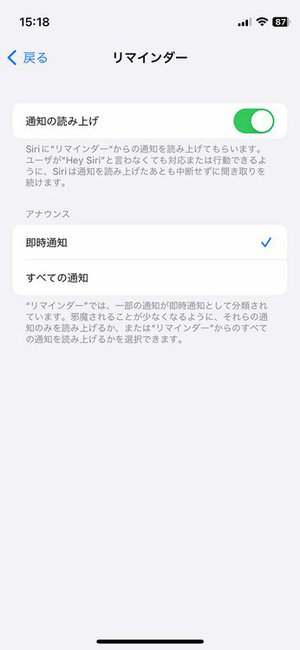 そこで便利なのが「通知の読み上げ」機能。AirPodsやBeatsの同機能対応イヤホン&ヘッドホンとの組み合わせでのみの動作となりますが、通知を通知音ではなく通知内容の読み上げで知らせてくれます。リマインダーなら「『〇〇さんに連絡』というリマインダーがあります」といった具合。AirPodsで音楽やポッドキャストなどを聴きながら作業をしていれば、それに割り込む形で耳に通知を届けてくれるわけです。
