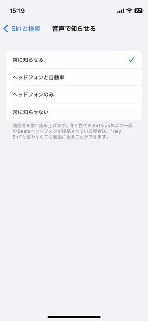 なお[設定]アプリ[Siriと検索]の中にある[音声で知らせる]も要注目。電話とFaceTimeの着信時に発信相手の名前を読み上げてくれる機能です。こちらはAirPods等だけでなく、iPhone本体スピーカーでの音声通知も可能だったりします。