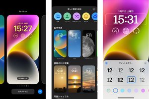 ロック画面を長押しするとカスタマイズ設定の画面に入れる。本体色にマッチする壁紙や時刻表示のフォント/カラーを選びたい。アクティビティリングや天気など、ウィジェットをロック画面に配置して使い勝手を高めることもできる。