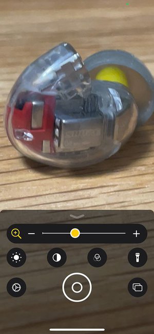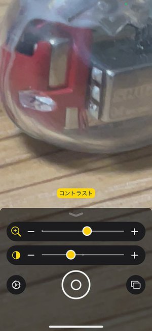 すると表示されるのが各種の追加コントロール。[明るさ][コントラスト][フィルタ][フラッシュライト][焦点ロック]などで映像の見え方を調整して、拡大部分をもっと見やすくできるのです。ここの表示内容は左下の歯車ボタンで呼び出せる設定画面でカスタマイズも可能。