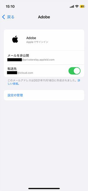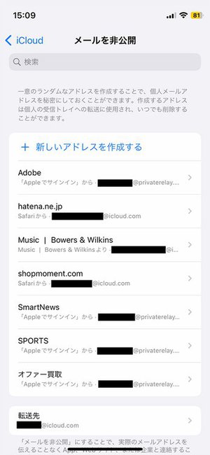 ですが、その増やしまくった無意味な文字列のエイリアスを、ユーザーが自分で「このエイリアスはあのアカウントに使ったやつでこっちはあれで」などと覚えておくのは無理。そこで用意されているのが前述の「優秀な管理画面」です。[設定]アプリ>[Apple ID]>[iCloud]>[メールを非公開]で確認してみましょう。これまでにユーザーが[+ 新しいアドレスを作成する]で作成、あるいは「Appleでサインイン」機能やSafariからの提案によって自動で作成されたエイリアスが一覧表示され、その内容を確認できます。