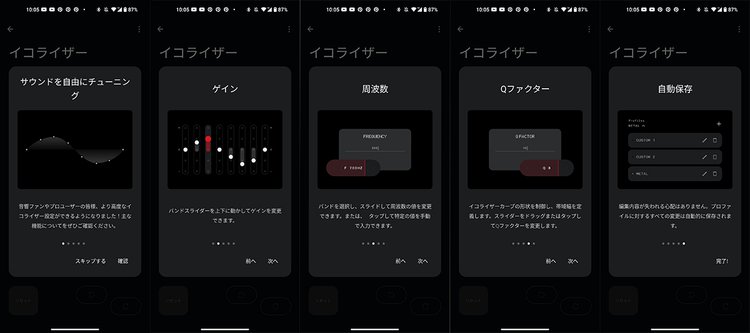 イコライザー(EQ)機能とは音質を好みに調整できるもので、多くのブランドが自社アプリを開発して実装している。大抵が低音/中音/高音であったり、いくつかのバンドにあらかじめ分けられた帯域に対して調整することが多い。