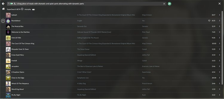 これは例を書いたほうが早いだろう。例えば“a long piece of music with dramatic and quiet parts alternating with dynamic parts”(静かなパートと動的なパートが繰り返される、ドラマティックな長い楽曲)という指示をした。これはプログレッシブロックを念頭においた指示だが、あえてジャンル名を使用せずに特徴を記述してみたわけだ。その結果が下記のスクリーン画像の通りだ。