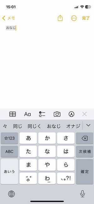 記号「々」は数字キー[8]の上フリックに割り当てられていますが、ひらがな「おなじ」からの変換でも入力可能。初回は変換候補の下の方にしか表示されないので見つけにくいですが、一回変換すれば次からは上の方に表示されるようになります。「人々」とか入力してから「人」を削除するやり方よりずっと効率的です。