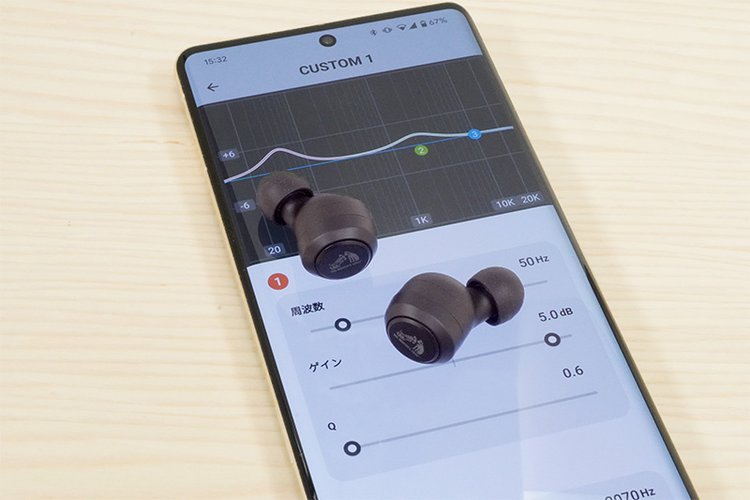 ではHA-FX150Tをスマートフォンに接続し、同社アプリ「Victor Headphones」を起動。サウンドモード設定の[CUSTOM 1〜3]がパライコの設定です。