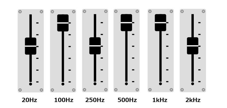 グラフィックイコライザー、通称グライコは、その名の通り視覚的なわかりやすさが特長。低域から高域までを何分割かにした周波数帯域のスライダーを上下させて調整。そのスライダーの上下の凹凸でセッティングを視覚的に把握でき、直感的に操作できます。