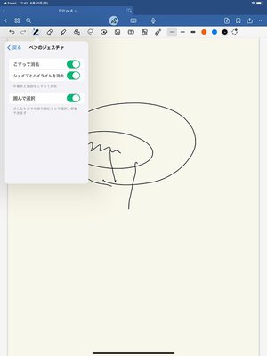 ペンのアイコンを長押しして「ペンのジェスチャ」を選択すると、いくつかのオン・オフを切り換えられる設定項目がある。「こすって消去」「シェイプとハイライトを消去」を選択すると、ノートに書いた文字やハイライトマーカー、図形などのシェイプがApple Pencilで対象箇所を塗りつぶすようなジェスチャ操作で消去できる。iPadOS 14以降から追加された、Apple Pencilでテキストボックスなどに手書きの文字を書いてデジタルタイピングに変換する「スクリブル」の機能でも、同じようにこすって消す機能が使える。操作感覚はよく似ている。