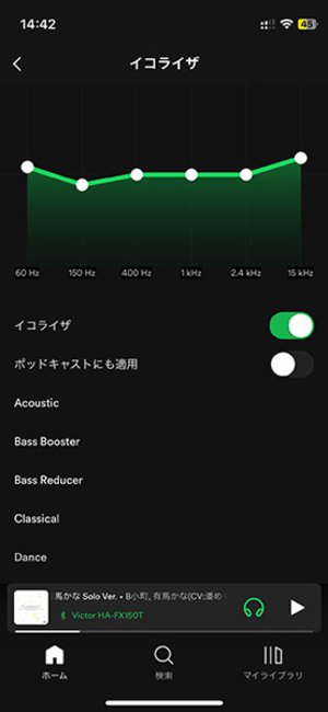 というわけで「Victor Headphones」アプリを起動。YOASOBI「アイドル」を例に低域をイコライジングしてみます。