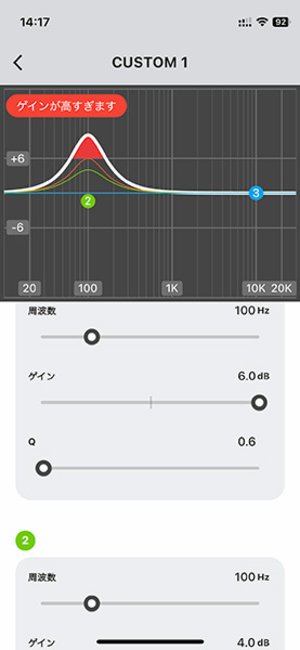 「ゲインが高すぎます」の警告が表示されますがイコライジング自体は機能します