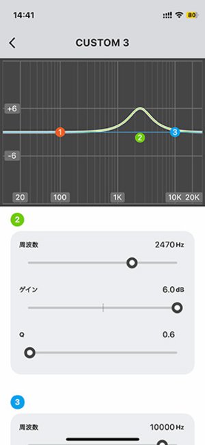 「Victor Headphones」アプリでサウンドモード「CUSTOM 3」の設定を開き、ポイント(2)の値を調整。