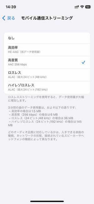Apple Musicの場合は[設定]アプリ>[ミュージック]>[オーディオの品質]>[モバイル通信ストリーミング]を確認。最小の[高効率]から最大の[ハイレゾロスレス]まで順に、音質が向上する代わりにデータ通信量も増加します。なおWi-Fi接続時の設定は別項目となっており、ここでの設定はモバイル通信時にのみ適用されるものです。
