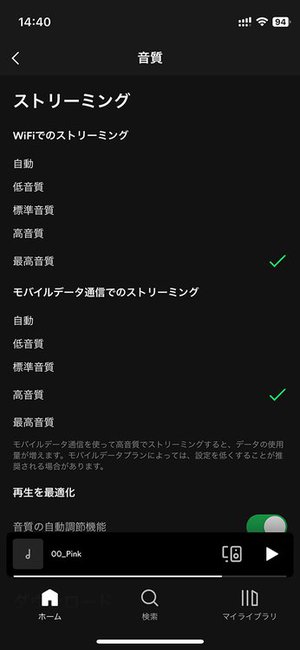 Spotifyの場合は、Spotifyアプリの[設定]画面から[音質]>[モバイルデータ通信でのストリーミング]に同じような選択肢があります。こちらもモバイル通信とWi-Fiは別の設定です。