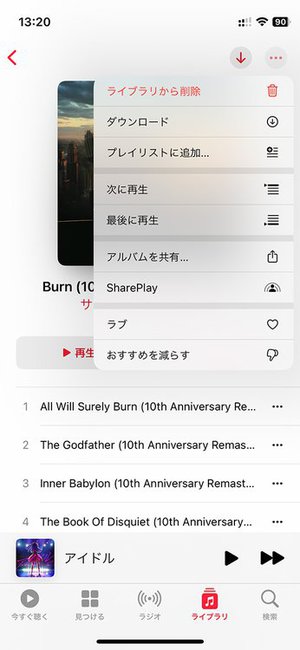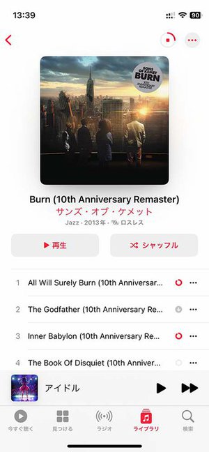 その設定を確認後、曲の右側、アルバムまたはプレイリストの右上に表示されている[↓]をタップ。もしくは[…]をタップするか曲、アルバム、プレイリストの長押しで表示されるメニューの中にある[ダウンロード]をタップ。するとその曲もしくはアルバムやプレイリストに含まれる全曲のデータがiPhoneのローカルストレージにダウンロードされるというわけです。以降その曲はモバイル通信を使わずローカルのデータから再生されるようになります。