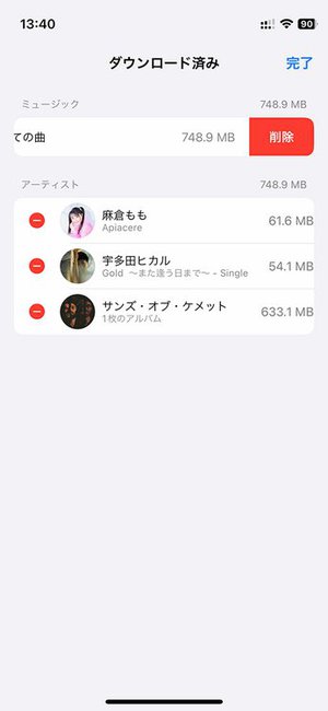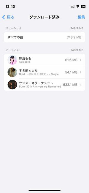 しかし、すると今度はデータ通信量の代わりにローカルストレージ容量が消費されることになるので、そこも要確認。[設定]アプリ>[ミュージック]>[ダウンロード]>[ダウンロード済み]で、これまでにダウンロード済みの合計容量や楽曲リストを確認できます。ダウンロード済みの楽曲がiPhoneのストレージ容量を圧迫していそうでしたら、この画面からダウンロード済みデータの削除も行えます。逐次整理しておきましょう。