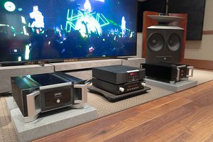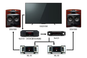 用意された製品群は、スピーカーにJBL「PROJECT EVEREST DD67000(以下「エベレスト」)」、パワーアンプにマークレビンソン「ML-50」を2台、プリアンプに「No523」。マークレビンソンのSACDプレーヤー「No5101」とレグザを光デジタルケーブルで接続し、No5101のDAC部でD/A変換した音声信号をアンプ部に送ってエベレストを鳴らす……というシステムが組まれた。