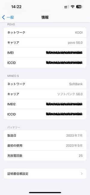 「充放電回数」の情報は、[設定]アプリ>[一般]>[情報]のページのいちばん下の[バッテリー]項目のひとつとして表示されます。