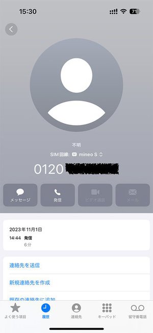 着信履歴の画面には、その履歴に折り返し発信する際に使用する回線をその場でさっと選択・変更できる、[SIM回線]という項目が用意されました。デフォルトでは「その通話を受けたSIM回線」か「その連絡先に前回かけた際のSIM回線」が選択されていますが、「知らない番号からだからメインの電話番号で折り返すのは不安」などの場合、サクッとそのように変更してから発信できます。