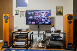 オーディオ機器での素性を確認したところで、今度はテレビとゲーム機が置かれている別の部屋に移動して、検証を続けよう。ステレオスピーカーをテレビの左右に配置、PS5からHDMIでテレビに繋ぎ、音声はテレビのミニジャックからLINNのアンプに入力されている(なお、最近流行りのHDMI搭載プリメインではない)。